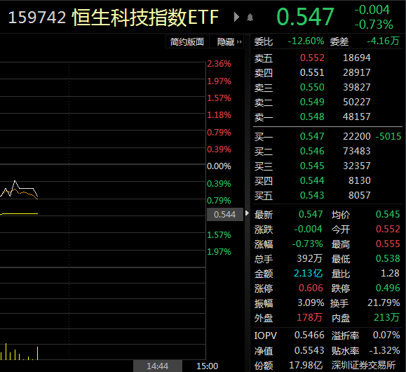 ETF方面,今日港股相关ETF大面积飘绿。截至发稿,博时恒生科技指数ETF(159742)跌0.73%,成交额超2亿元,换手率21.79%,交投活跃,盘中频现溢价交易。