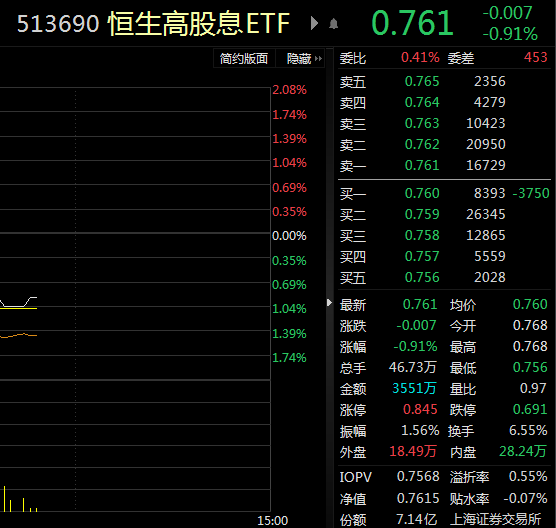 恒生高股息ETF(513690)跌近1%,盘中溢价显著,溢价率达0.55%。