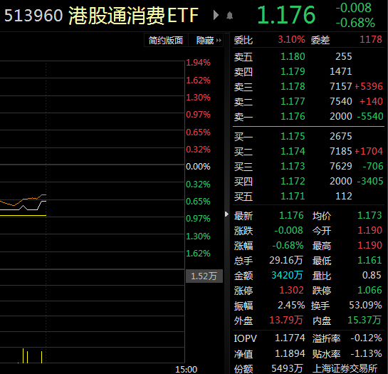 此外,港股通消费ETF(513960)跌0.68%,成交额超3000万元,换手率53.09%,交投活跃。