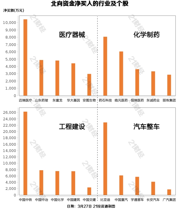 从净买入金额来看,北向资金增持了50个行业,其中医疗器械居首,净买入金额达5.27亿元,其次是化学制药行业,净买入4.13亿元。