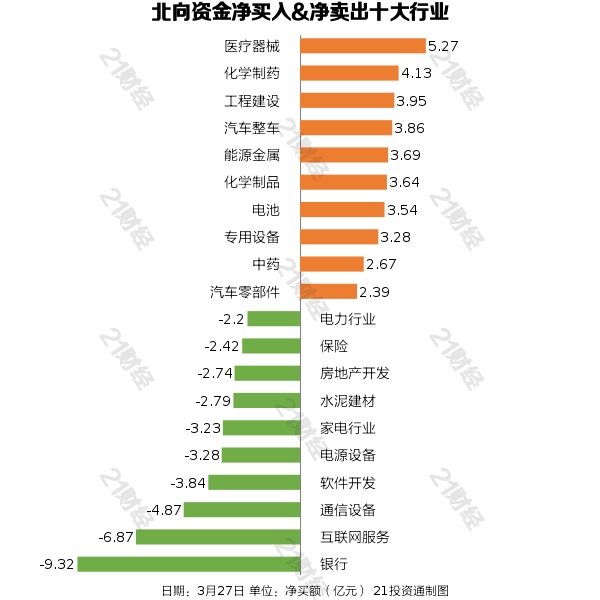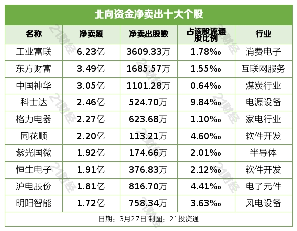 据21投资通智能监测,3月27日,北向资金净卖出6.94亿元,其中沪股通净卖出3.78亿元,深股通净卖出3.16亿元。