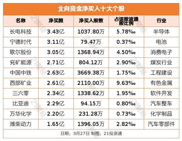 个股方面,北向资金净买入长电科技(600584.SH)、宁德时代(300750.SZ)、歌尔股份(002241.SZ)、兖矿能源(600188.SH)、中国中铁(601390.SH)居前,其中,长电科技被净买入3.43亿元,宁德时代被净买入3.11亿元,歌尔股份被净买入3.05亿元,兖矿能源被净买入2.71亿元,中国中铁被净买入2.63亿元。