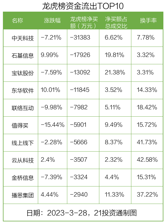 而龙虎榜中资金净流出最多的是中天科技(600522.SH),被净卖出为3.14亿元,占总成交金额的6.62%。中天科技收盘下跌7.21%,换手率为7.78%。