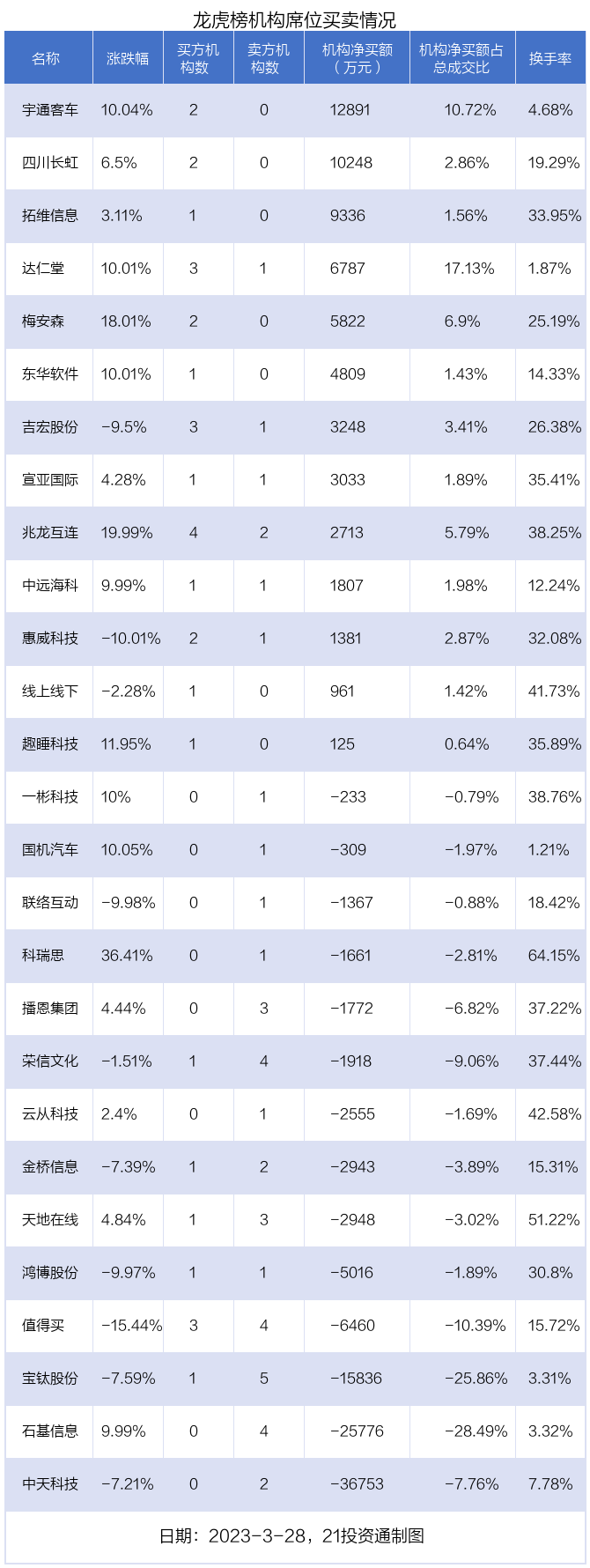 03月28日,27只个股龙虎榜出现了机构的身影,机构合计净卖出4.24亿元。具体来看,机构净买入13股,净卖出14股。