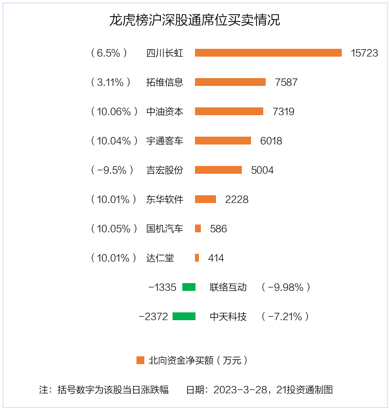 3月28日,上证指数下跌0.19%,深证成指下跌0.72%,创业板指下跌1.2%。盘后龙虎榜数据显示,共有43只个股因当日异动登上龙虎榜,资金净流入最多的是四川长虹(600839.SH),达2.57亿元。沪深两市今日成交额10042亿,较上个交易日缩量1358亿。总体上个股跌多涨少,两市超3400只个股下跌。