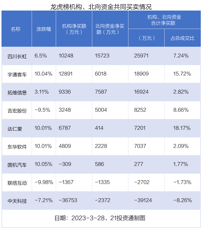 值得注意的是,机构和北向资金共同净买入了四川长虹、拓维信息、宇通客车、吉宏股份、东华软件、达仁堂等6股;共同净卖出了联络互动、中天科技等2股;在国机汽车上出现分歧,机构净卖出国机汽车308.61万元,北向资金净买入585.78万元。