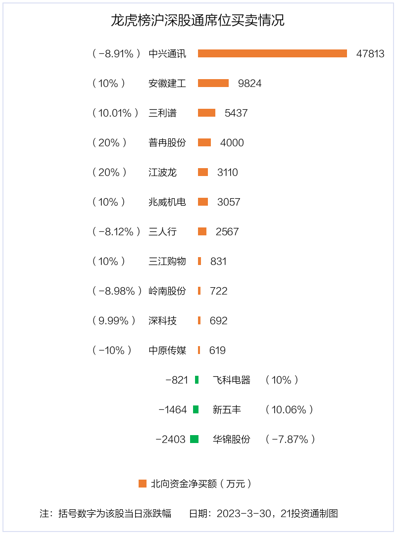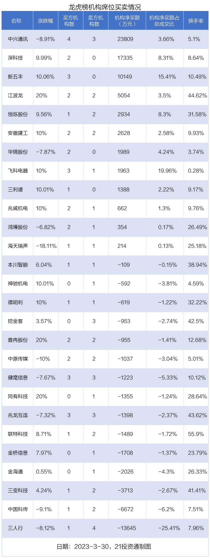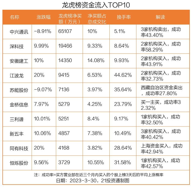 3月30日,上证指数上涨0.65%,深证成指上涨0.62%,创业板指上涨0.5%。盘后龙虎榜数据显示,共有40只个股因当日异动登上龙虎榜,资金净流入最多的是中兴通讯(000063.SZ),达6.51亿元。