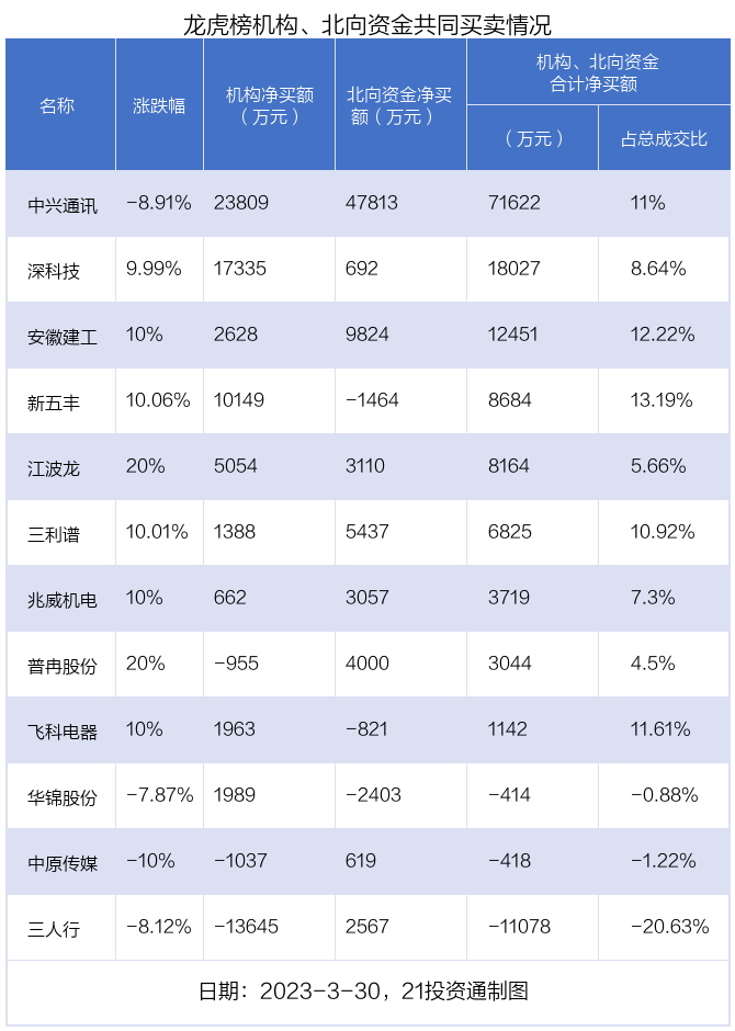 值得注意的是,机构和北向资金共同净买入了中兴通讯、安徽建工、三利谱、江波龙、兆威机电、深科技等6股;在普冉股份,三人行,中原传媒,飞科电器,新五丰,华锦股份上出现分歧,机构净卖出普冉股份955.06万元,北向资金净买入3999.52万元;机构净卖出三人行1.36亿元,北向资金净买入2566.88万元;机构净卖出中原传媒1036.63万元,北向资金净买入619.1万元;机构净买入飞科电器1963.32万元,北向资金净卖出821.1万元;机构净买入新五丰1.01亿元,北向资金净卖出1464.48万元;机构净买入华锦股份1989.44万元,北向资金净卖出2403.29万元。