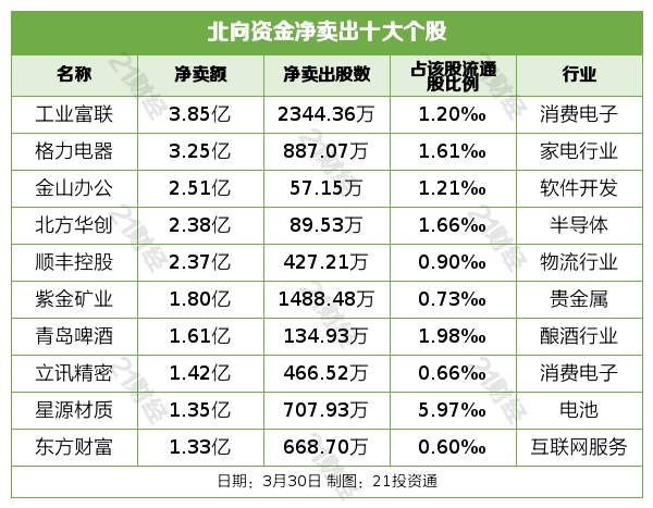 北向资金净卖出工业富联(601138.SH)、格力电器(000651.SZ)、金山办公(688111.SH)、北方华创(002371.SZ)、顺丰控股(002352.SZ)居前,其中,工业富联被净卖出3.85亿元,格力电器被净卖出3.25亿元,金山办公被净卖出2.51亿元,北方华创被净卖出2.38亿元,顺丰控股被净卖出2.37亿元。