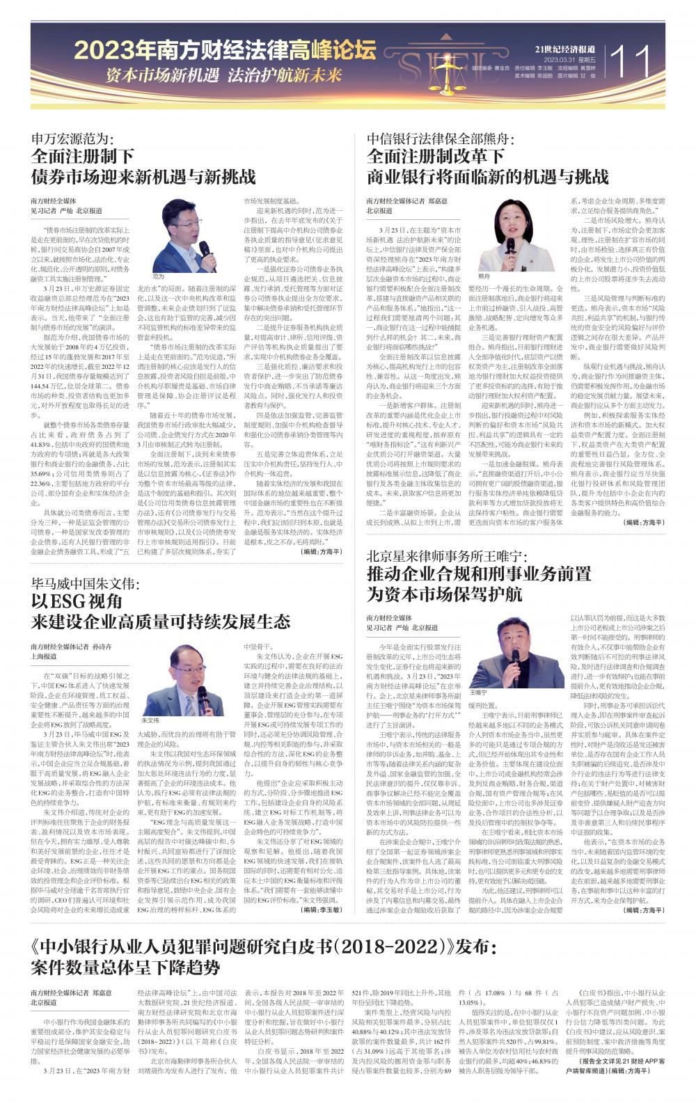 3月23日,由南方财经全媒体集团指导,21世纪经济报道、南方财经法律研究院、21世纪资本研究院联合主办的“2023年南方财经法律高峰论坛”在北京举行。论坛由北京星来律师事务所联合主办,宁波银行、北京市海勤律师事务所、中国律师博物馆提供支持。本次论坛邀请到了山东大学讲席教授、最高检理论研究所原所长谢鹏程,北京金融法院立案庭庭长、审判委员会委员陈广辉,中国上市公司协会党委委员、副会长余辉等嘉宾以及金融机构领导、专家学者、资深律师,针对全面注册制下的资本市场高质量发展、金融腐败和防控金融风险的关系、疫情后“不良资产”发展新路径等问题建言献策。