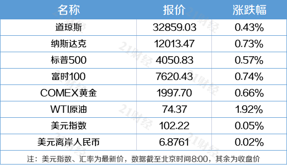 1、美国三大股指全线收涨,道指涨0.43%,标普500指数涨0.57%,纳指涨0.73%。英特尔涨1.81%,波音涨1.46%,领涨道指。中概股普遍上涨,能链智电涨18.92%,禾赛科技涨12.75%,京东涨7.82%。
