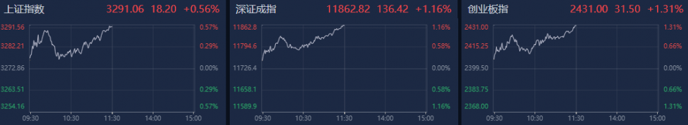 今日(4月3日)上午,A股三大指数高开高走,深证成指、创业板指涨超1%。南财金融终端显示,截至上午收盘,上证指数涨0.56%,深证成指涨1.16%,创业板指涨1.31%。沪深两市个股涨多跌少,合计超2800只个股上涨。