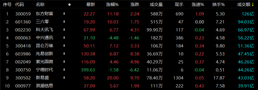 沪深两市半日成交额7798亿,较上个交易日同期放量2311亿。个股方面,截至午间收盘,东方财富成交额排名第一,达126亿元;三六零、科大讯飞、中兴通讯、昆仑万维成交额紧随其后,分别为94.03、66.97、56.22、51.36亿元。