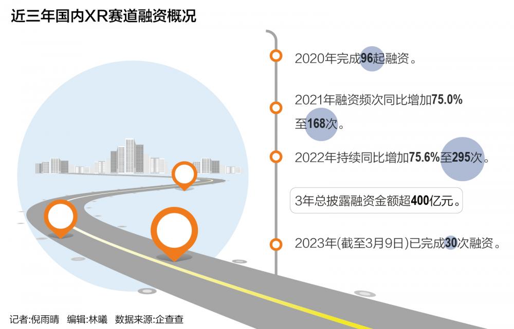 企查查数据显示,2020年至2022年3年期间,XR赛道资本市场热情稳定提升,2023年(截至3月9日)则已完成30次融资。其中,2020年相关产品合计完成96起融资,总披露融资金额超百亿,次年融资频次同比增加75.0%至168次,2022年持续同比增加75.6%至295次,3年总披露融资金额超400亿元。