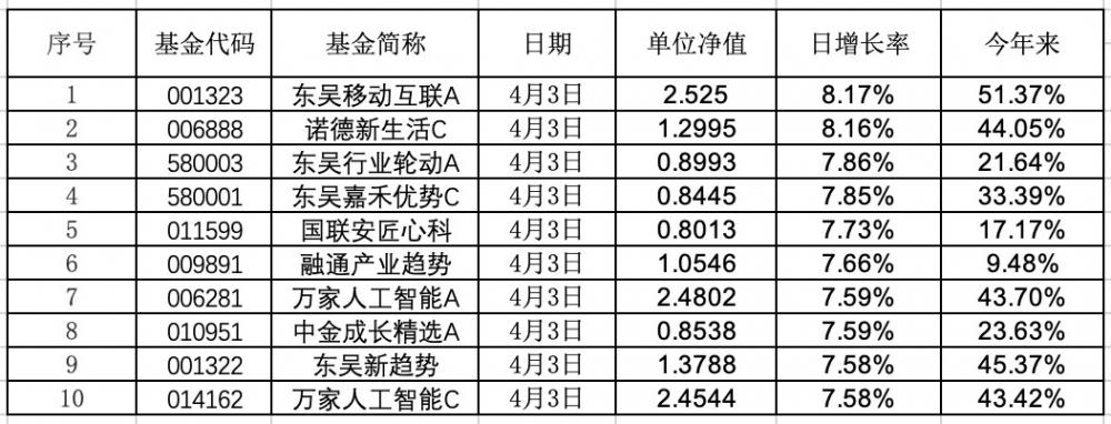 最新公布的基金净值显示,仅4月3日一个交易日,就有16只基金产品单日净值涨幅超过7%,有超过100只基金产品单日净值涨幅超过5%。