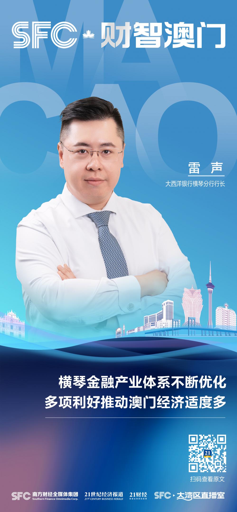 雷声:开业以来,我行坚定执行澳门大西洋银行制定的“跟随我们的客户”战略,根据澳门总行制定的经营方针,专注为澳门总行现有客户在境内的投资营运、置业和生活提供资金支持和金融服务,也针对具有澳门、香港及葡语系国家背景的中小型企业和大型企业提供多样化贷款等金融服务以供选择。通过合作区连接粤港澳大湾区,辐射全国,将给类似我行的澳资金融企业带来巨大发展空间和长期收益。“横琴金融30条”给予了很大的研究空间,我们分行与总行也密切关注相关细则, 希望在短中期内推进市场开放和互联互通,从而更好地利用澳门总行现有资源和系统服务于合作区客户。