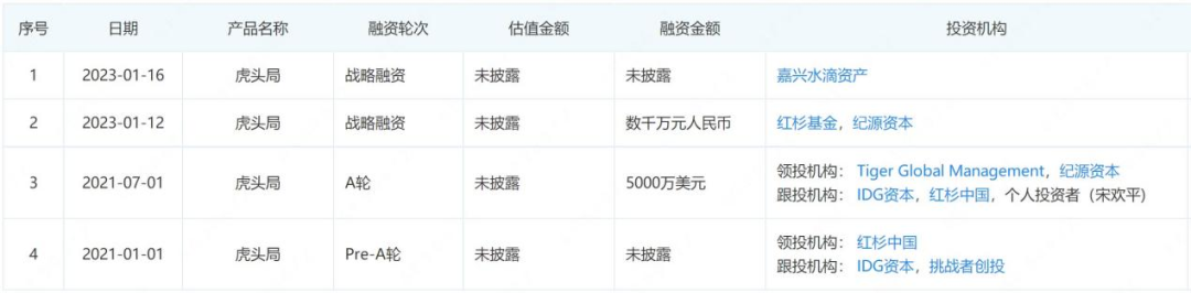 据晚点Late Post报道,当年许多投资机构想投虎头局都投不了,最后能够入围的都是知名投资机构。例如2021年1月的Pre-A轮融资,领投的是红杉中国,跟投的是IDG资本和挑战者创投。