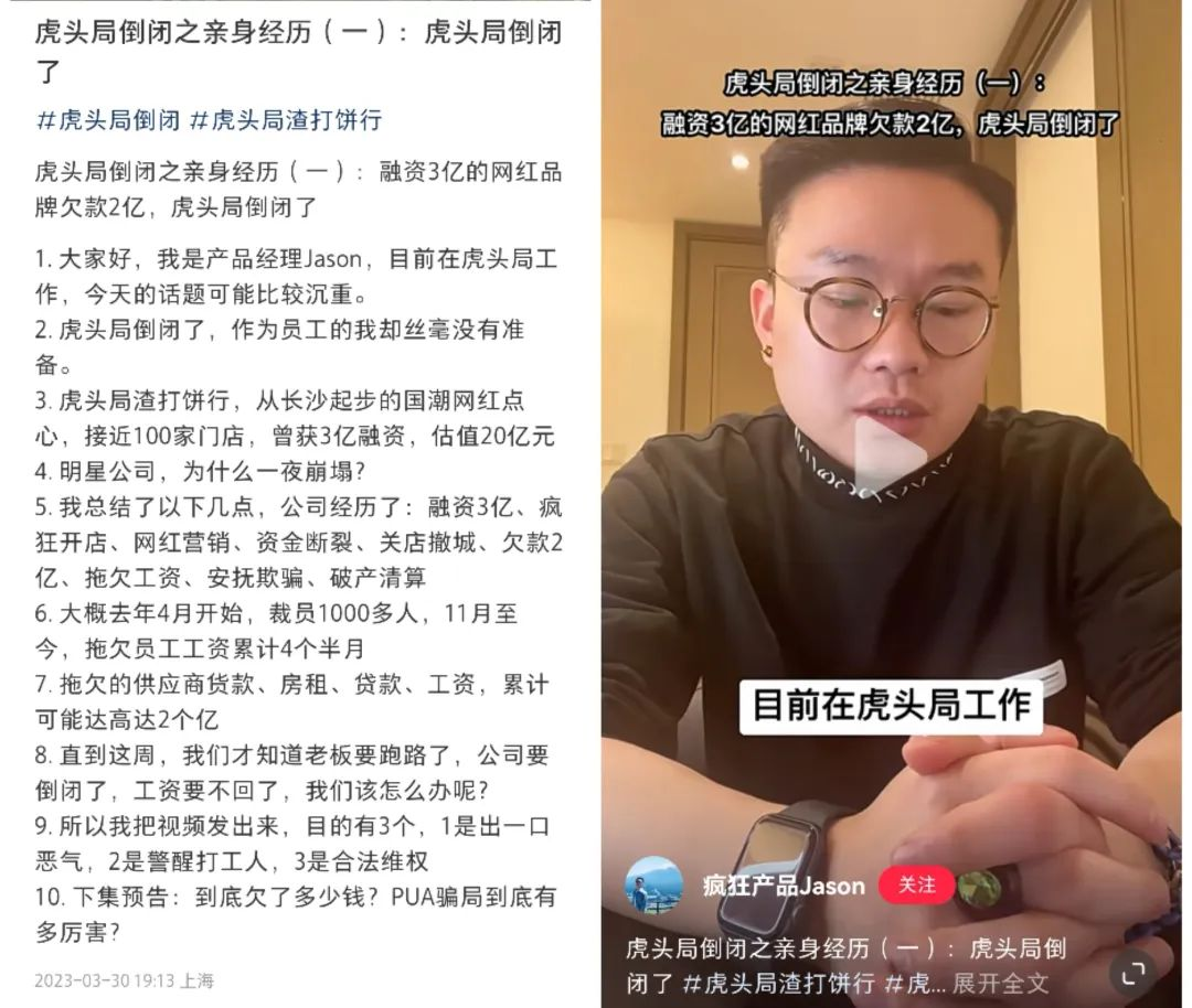 3月30日,小红书用户“疯狂产品Jason”发了一篇帖子,标题直指“虎头局倒闭”。