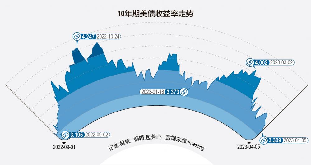 随着一系列糟糕的经济数据公布,美联储紧缩预期降温,4月5日,有着“全球资产定价之锚”之称的10年期美债收益率再度下挫,一度跌至3.27%下方,创下2022年9月7日以来最低,2年期美债收益率一度跌破3.7%关口,3个月期美债收益率则在4.9%附近徘徊。