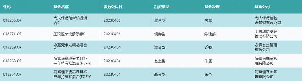 上周有5只新基金发行,分别为:光大保德信新机遇混合C、工银恒享纯债债券C、永赢竞争力精选混合C、海富通稳健养老目标一年持有期混合(FOF)Y、海富通平衡养老目标三年持有期混合(FOF)Y,详情见下表: