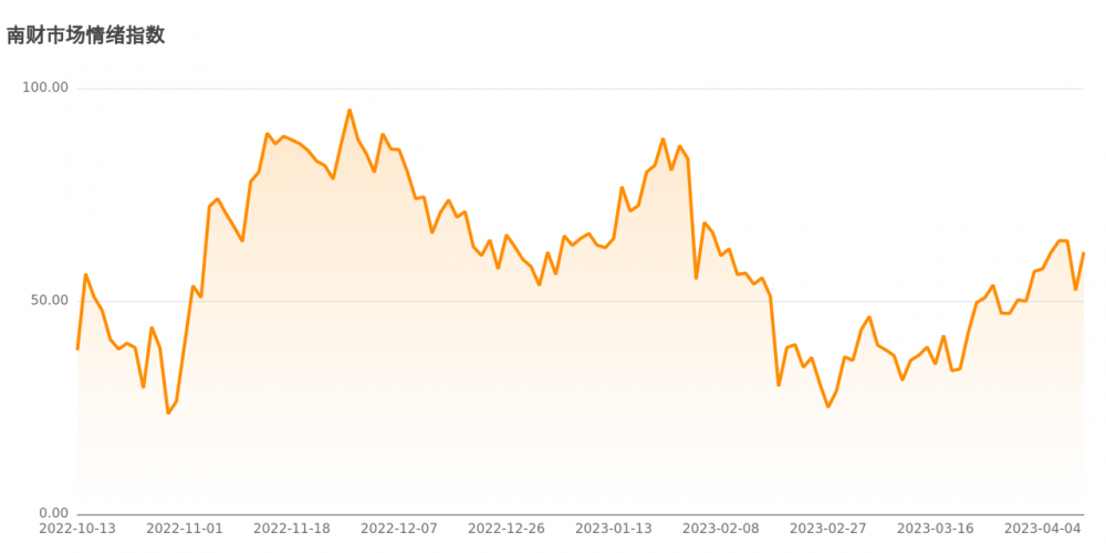 今日南财市场情绪指数为61.6,较前一交易日52.6大幅上涨,市场投资热度明显提升。