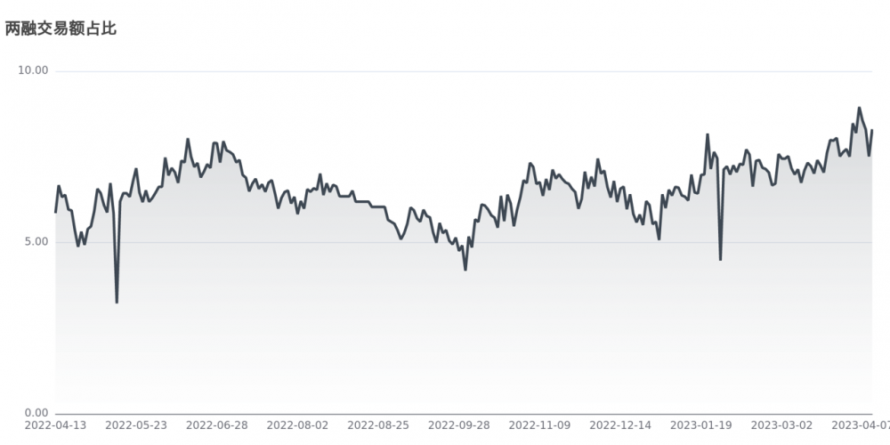 今日该指标值为8.31%,目前该指标处于近一年较高区间,认为当前A股市场相对较强。反映场内投资者借钱炒股的杠杆水平,该指标越高说明杠杆水平越高,即投资者认为当前市场较强,反之则说明投资者认为市场相对较弱,因而与上证指数存在较强的正相关性。