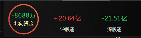 北向资金尾盘回流,全天小幅净卖出0.87亿元,早盘一度净卖出近30亿元;其中,沪股通净买入20.64亿元,深股通净卖出21.51亿元。