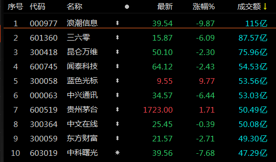 沪深两市今日成交额11369亿,较上个交易日放量47亿,连续第8个交易日突破1万亿元。其中,沪市成交额4775.9亿元,深市成交额6592.6亿元。浪潮信息成交额居首,为115亿元。其次三六零、昆仑万维、闻泰科技、蓝色光标,成交额分别为87.6亿元、76亿元、54.5亿元、53.6亿元。