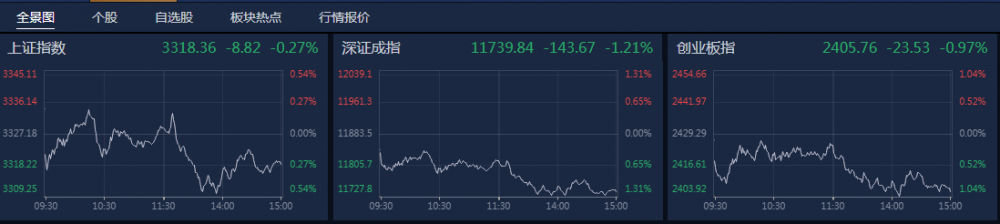 大盘全天震荡调整,三大指数均小幅下跌,深成指领跌。南财金融终端显示,截至收盘,沪指跌0.27%,深成指跌1.21%,创业板指跌0.97%。