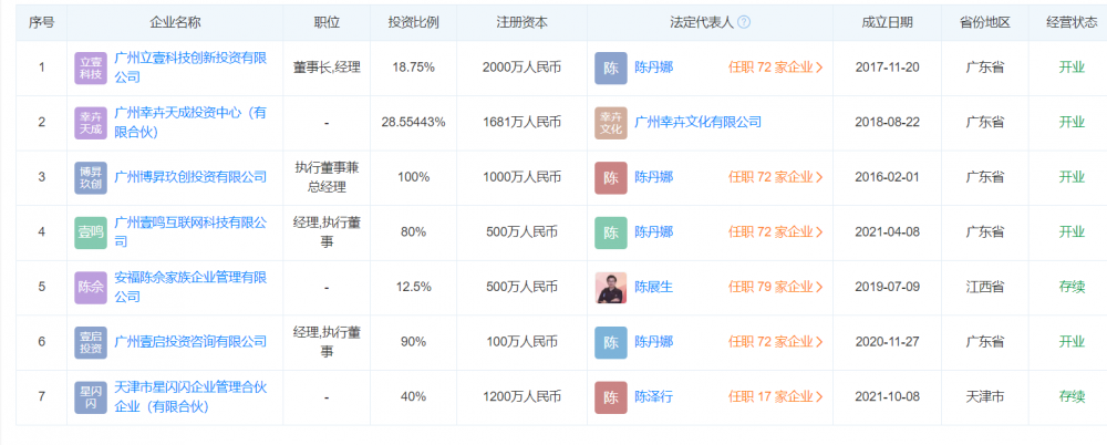 不过,和父辈当年手揣3000元来广州创业不同,陈丹娜的起点自然要高得多。她拥有立壹科技18.75%的股份。身边还有长辈辅导,其伯父陈凯臣,立白联合创始人之一,持股26.25%。