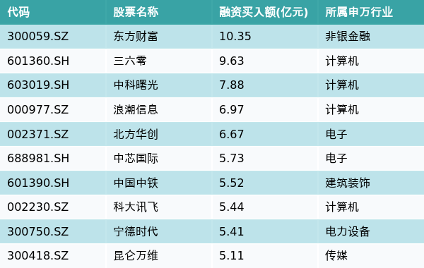4月17日,两市共有3149只个股有融资资金买入,其中东方财富、三六零、中科曙光排名前三,买入金额分别10.35亿元、9.63亿元、7.88亿元。融资买入额前10个股详情见下表: