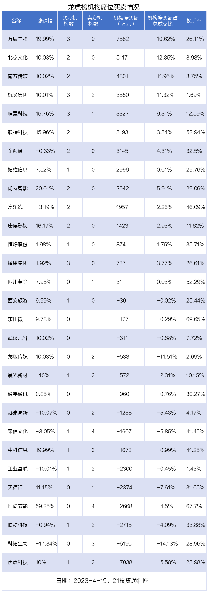 4月19日,29只个股龙虎榜出现了机构的身影,机构合计净买入1.04亿元。具体来看,机构净买入14股,净卖出15股。