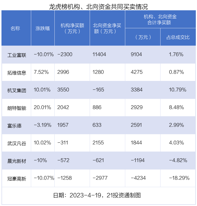 4月19日,北向资金参与龙虎榜中的个股共有8只,合计净买入1.26亿元。其中沪股通净买入1 股,净卖出3 股,合计净买入7640.89万元;深股通净买入4 股,,合计净买入4954.55万元。