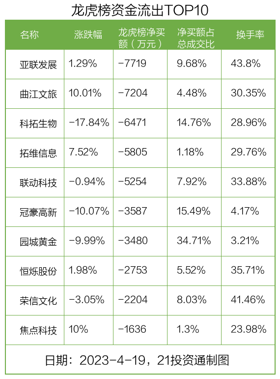 而龙虎榜中资金净流出最多的是亚联发展(002316.SZ),被净卖出为0.77亿元,占总成交金额的9.68%。亚联发展收盘上涨1.29%,换手率为43.8%。
