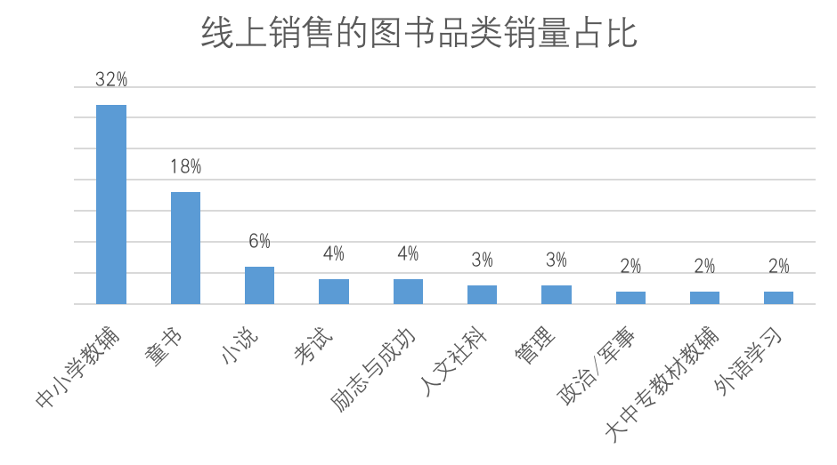 京东的销售情况显示,2023年图书类销量占比最高的是教辅和考试类书籍,销量占比40%,其中,中小学教辅书销量占32%。此外,童书销量占比18%,小说、励志与成功、人文社科类图书占比3%—6%。