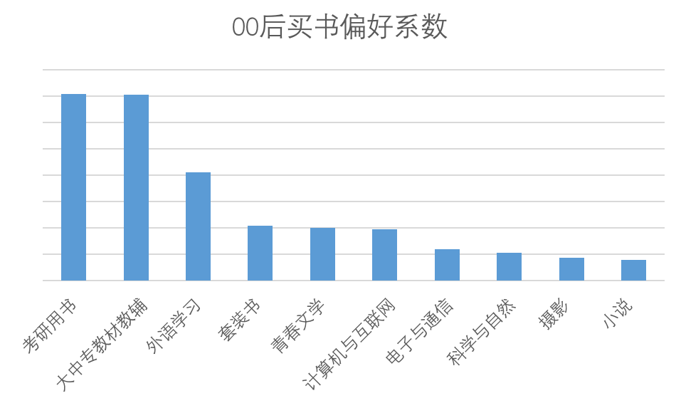 从00后的网购图书偏好来看,00后读书的主要压力在于考研。他们在考研用书、大中专教材教辅、外语学习类图书的消费偏好最高,同时也爱买青春文学、摄影图书和小说。