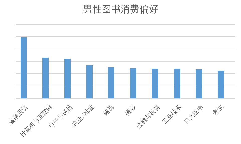 男性消费者对金融投资、计算机与互联网等领域更感兴趣,阅读兴趣比较偏向专业领域的知识类书籍。而女性则更喜欢购买与家庭教育和艺术相关的图书,在童书、家教及时尚、音乐类图书的消费偏好较高。