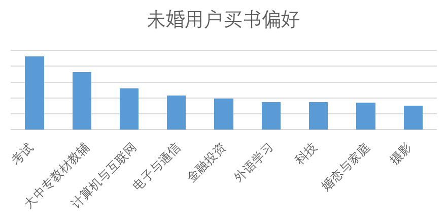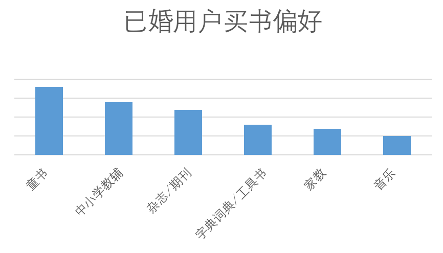 已婚用户的书籍购买量是未婚用户的4倍,买走了8成以上的图书。从品类偏好来看,未婚用户网购考试、教辅书、计算机等专业书的占比高于整体,读书主要是为了拼事业和前程。然而在结婚后买书的重心改变了,已婚用户在童书、中小学教辅、家教等品类的消费占比高于整体,教育下一代成为网购图书的第一出发点。