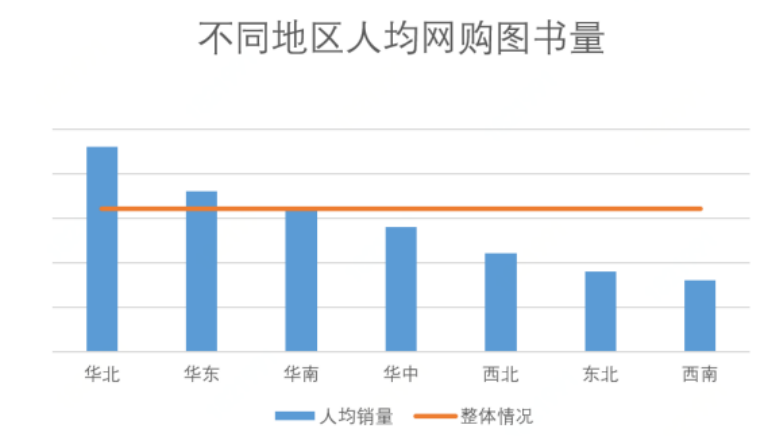 从区域来看,华北、华东地区人均网购图书量高于全国均值1%-4%,华南地区人均网购图书量与全国均值基本相当,华中、西北、东北、西南地区人均网购图书量低于全国均值。