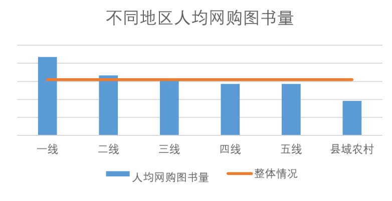 不同地区网购图书的表现存在明显的差异。一线城市人均网购图书量高于全国均值8.8%,二线城市人均网购图书量高于全国均值1.6%,三至五线城市网购图书量略低于全国均值,县域农村人均网购图书量低于全国均值8.8%。