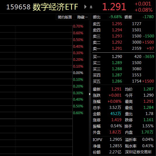 截至发稿,数字经济ETF(159658)盘中飘红,涨0.08%,盘中频现溢价交易,溢折率为0.04%。