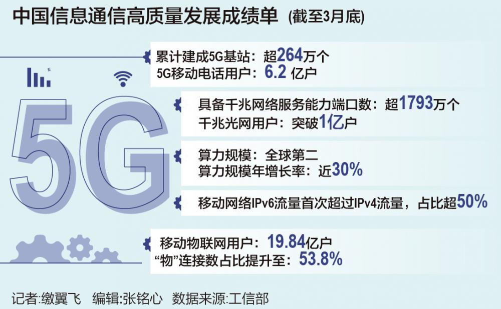 截至3月底,我国累计建成5G基站超264万个,具备千兆网络服务能力的端口数超1793万个,实现“市市通千兆”“县县通5G”。