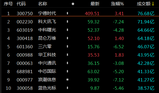 沪深两市今日成交额7897亿,较上个交易日放量1031亿。宁德时代以76.68亿元成交额居首,其次是科大讯飞,成交额为71.94亿元,中科曙光、昆仑万维、三六零等成交额紧随其后。