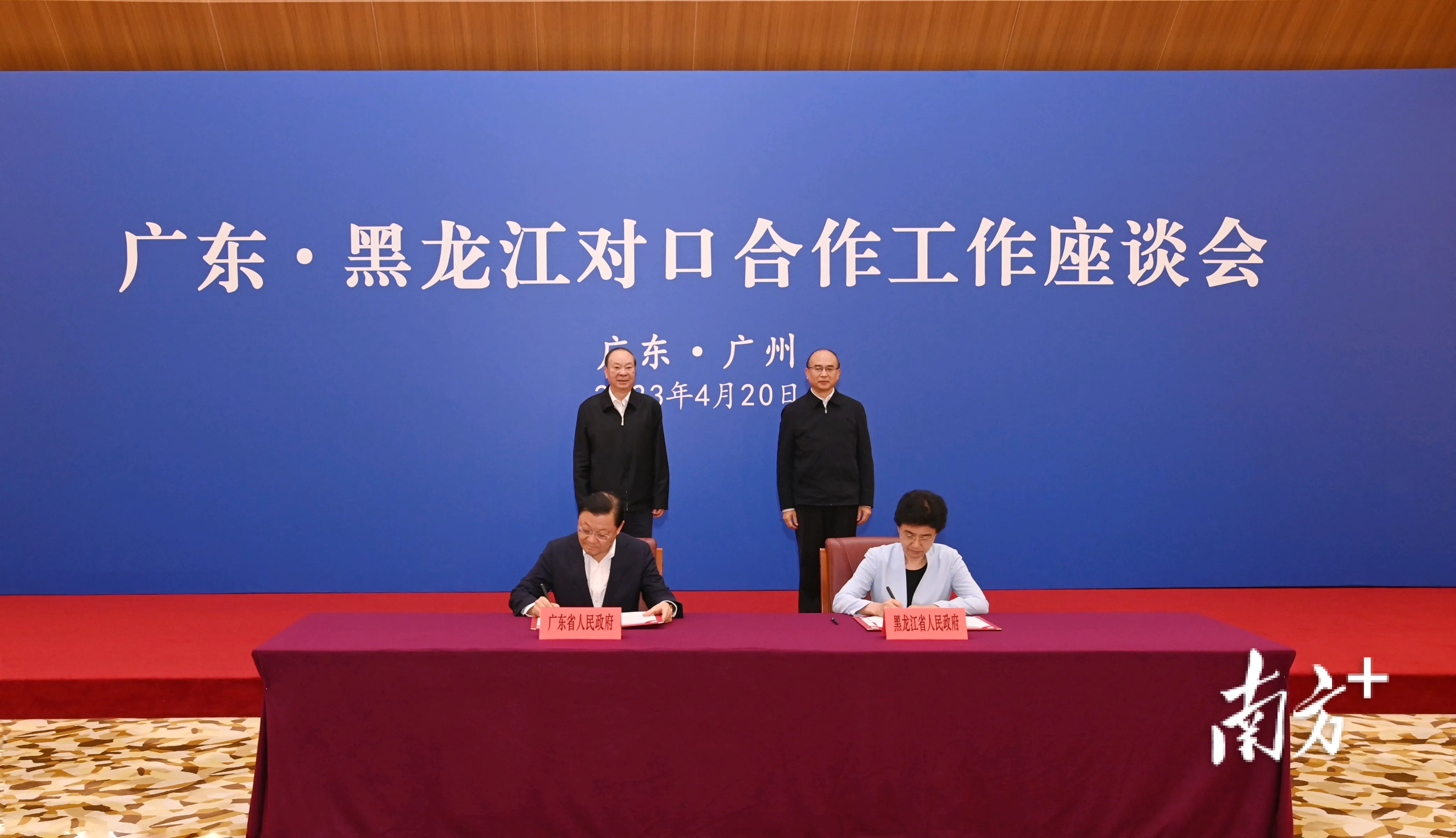 4月20日下午,广东·黑龙江对口合作工作座谈会在广州召开,在省委书记黄坤明、黑龙江省委书记许勤共同见证下,两省签署对口合作高质量发展框架协议。南方日报记者 王辉 肖雄 摄
