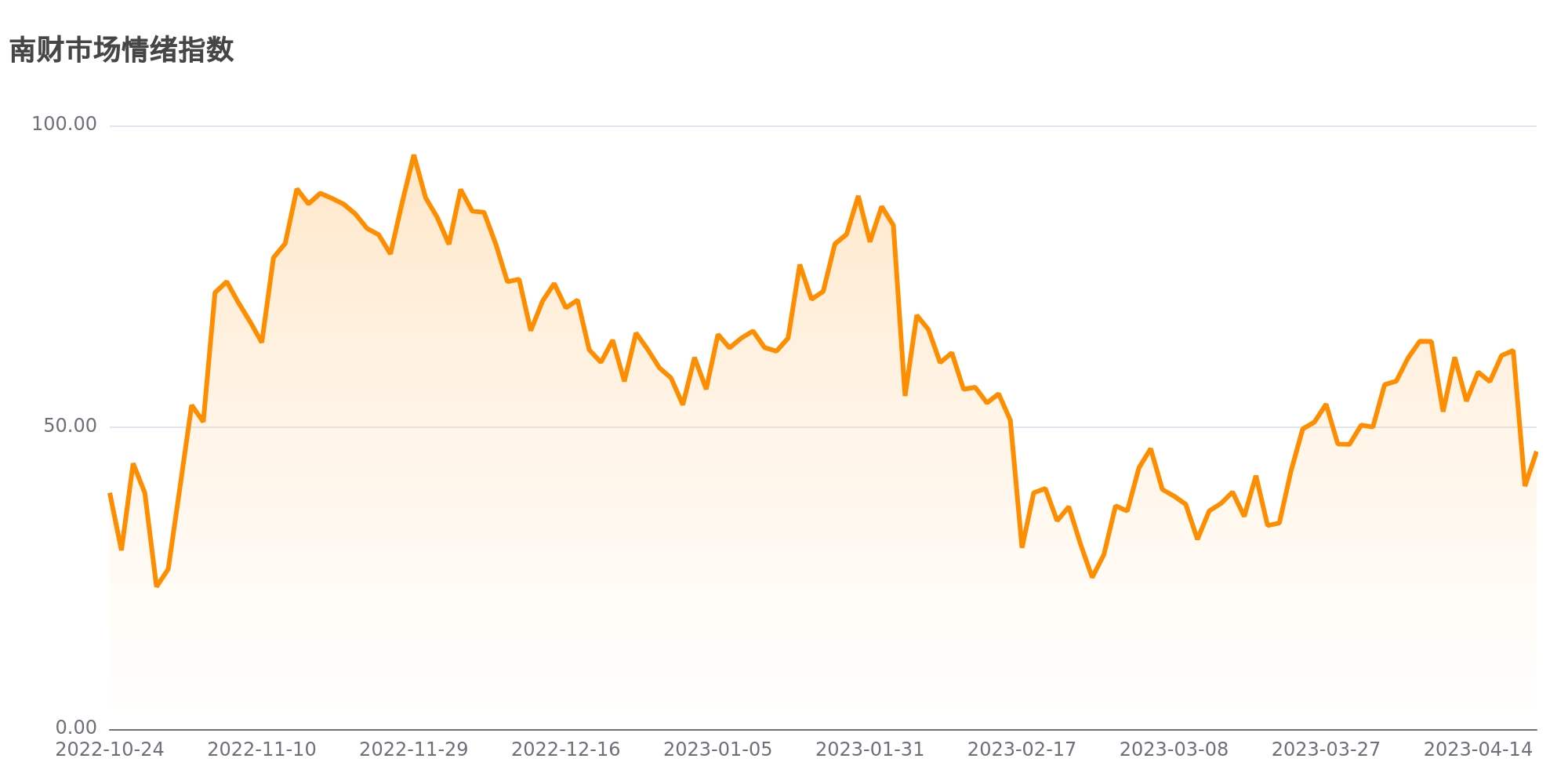 今日南财市场情绪指数为46.0,较前一交易日40.3大幅上涨,市场投资热度明显提升。