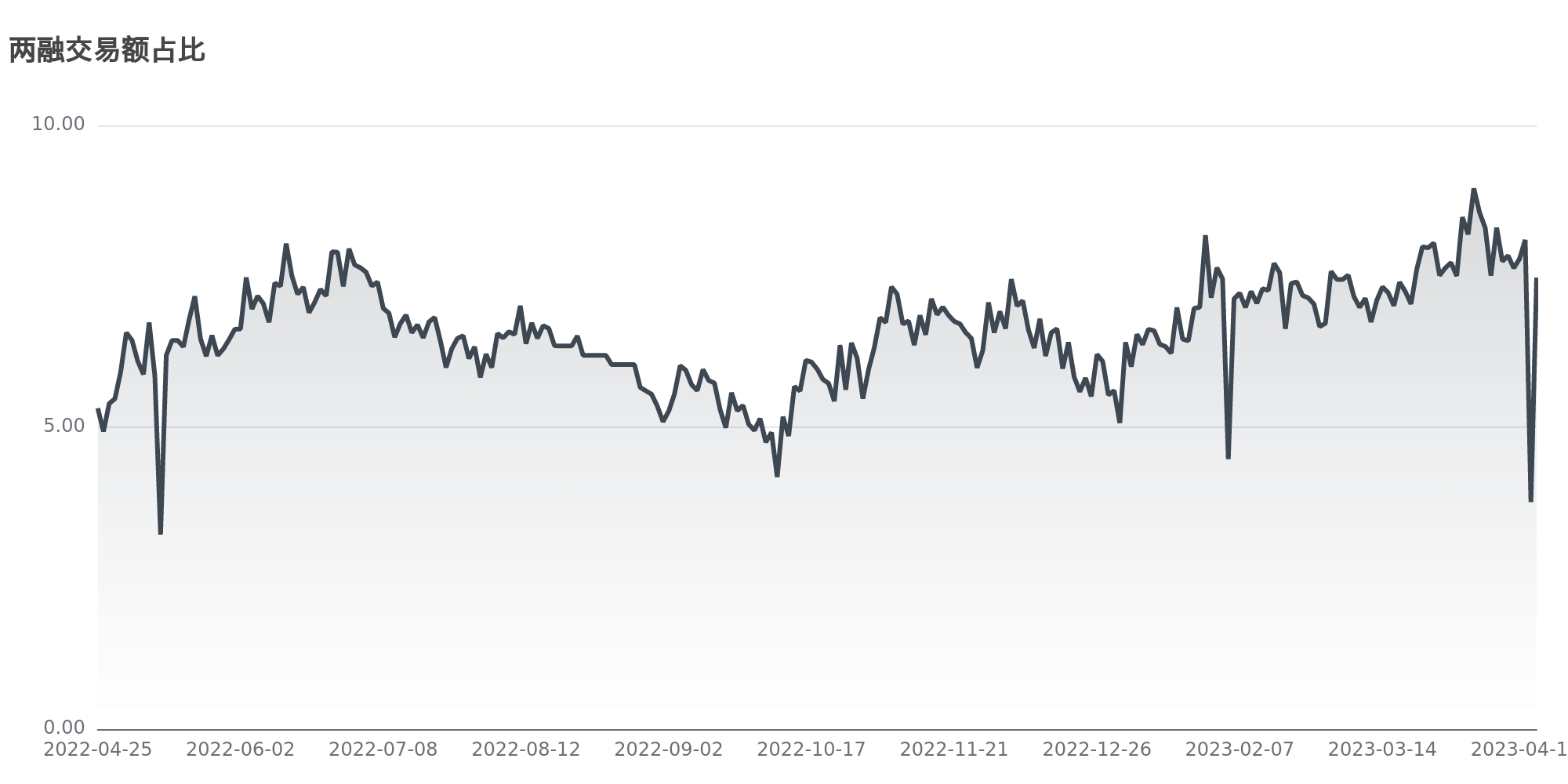 今日该指标值为7.48%,目前该指标处于近一年较高区间,认为当前A股市场相对较强。反映场内投资者借钱炒股的杠杆水平,该指标越高说明杠杆水平越高,即投资者认为当前市场较强,反之则说明投资者认为市场相对较弱,因而与上证指数存在较强的正相关性。