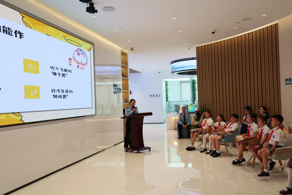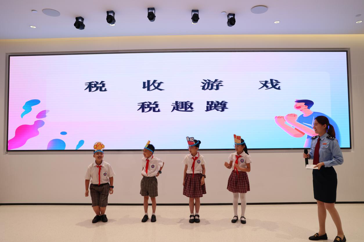 走进智慧办税厅,税收大家庭、我们身边的税收、税款的旅行、税收让我们生活更美好四块展板映入眼帘,讲解员一边介绍一边引着12名中小学生进入税收普法基地。