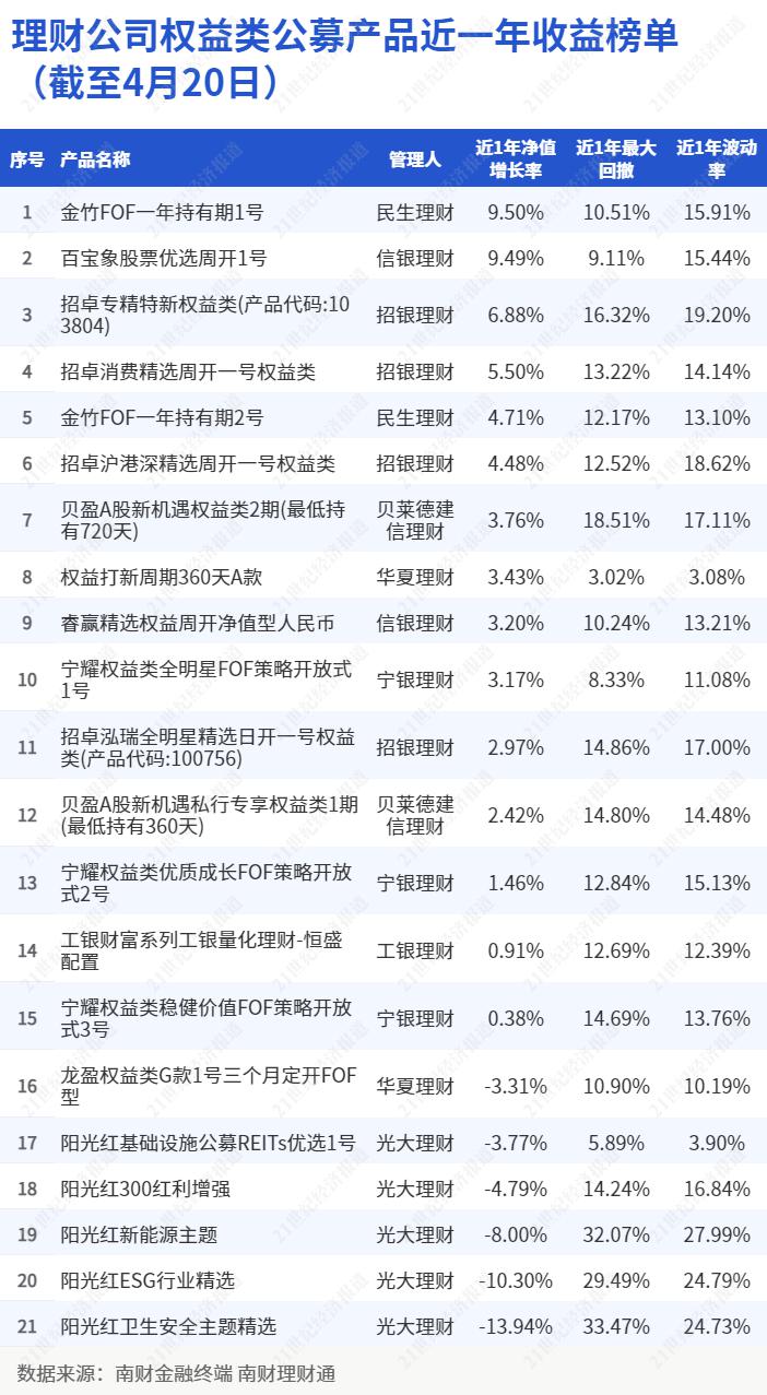 截至2023年4月20日,根据南财理财通数据,在存续期超一年的21只公募权益类理财产品中,有15只产品的近一年净值增长率录得正收益,占比71.4%。