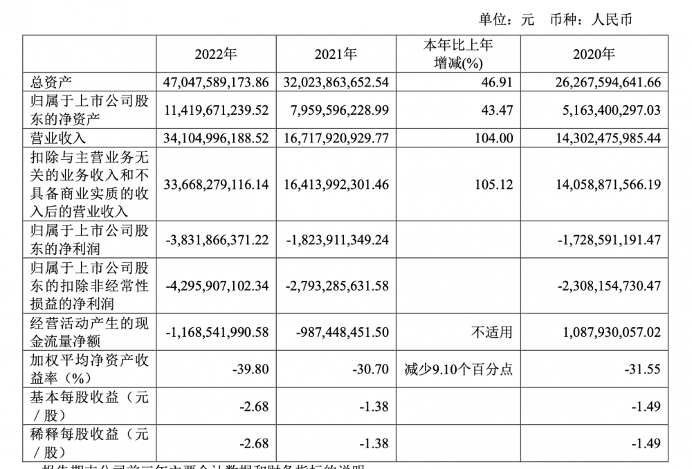 4月28日晚间,赛力斯集团股份有限公司(以下简称“赛力斯”,601127.SH)发布了2022年财报。报告显示,赛力斯2022年营收341.05亿元,同比增长104%;其中,新能源汽车业务收入249.34亿元,同比增长482.8%,占公司营业收入的73.1%。2022年净亏损为38.32亿元,较去年同期的18.24亿元净亏损扩大110.01%。