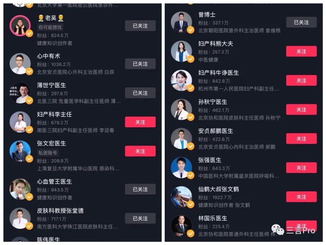 笔者在抖音上以关键词“医生”搜索,能查到数以百计的“黄V”认证医生账号。这些医生账号,粉丝量从几十万到几百万不等,甚至还有部分账号粉丝超过千万。